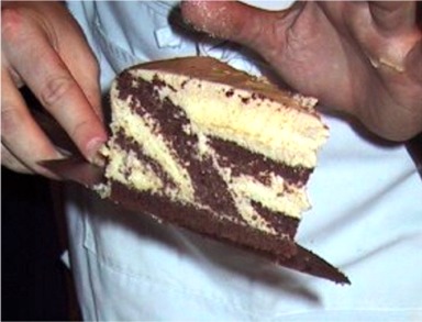 Immediately, using a thin, serrated knife, dipped in hot water, cut out a cone-shaped piece from the layered cake from the center of the cake.