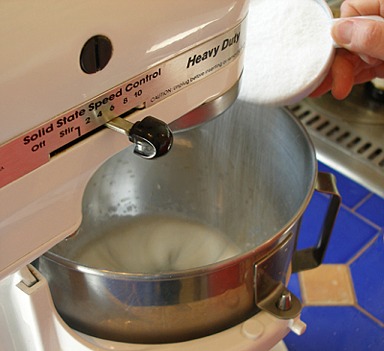 3. Begin adding the sugar, a little at a time, till it is incorporated.
