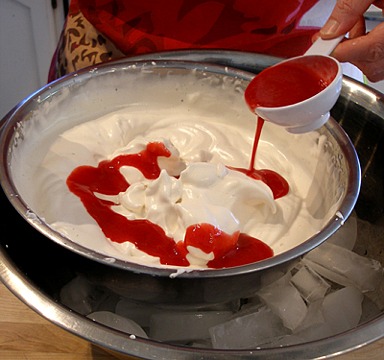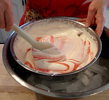 4. Gently fold it into the mixture with a large rubber spatula, leaving visible streaks of raspberry puree.
