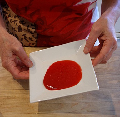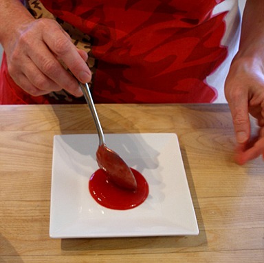 1. Place a few tablespoons of raspberry puree on an individual rimmed dessert plate, tipping plate to spread it evenly.