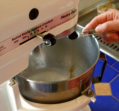2. Add the cream of tartar and vanilla extract and increase the mixer speed to medium high speed.