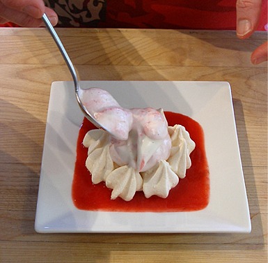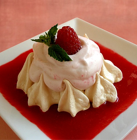 Raspberry Cloud Cups…meringue cups filled with Sarah's “New Whipped Cream” with raspberry puree folded in. Set on a sea of raspberry coulis.