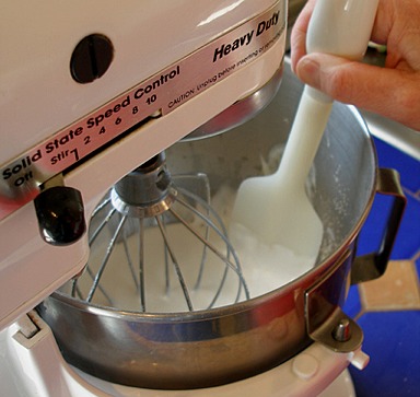 4. When all the sugar has been added, stop the mixer and clean the sides of the bowl with a large rubber spatula, to make sure all the sugar has been incorporated.