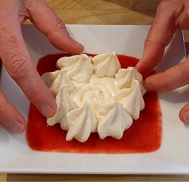 2. Place one baked meringue cup on the puree.